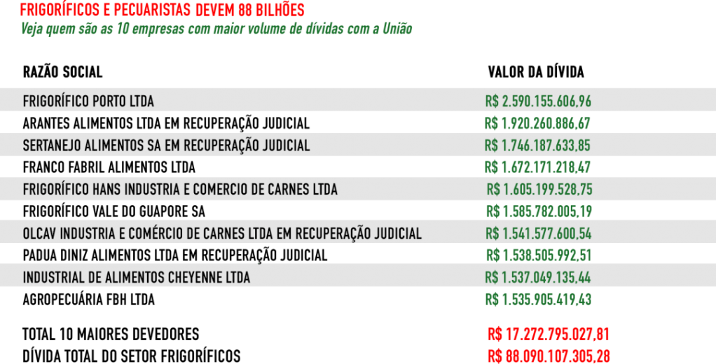O site de Olho Nos Ruralistas, um observatório de agronegócio e acompanha a corrupção e o lobbying dos ruralistas na política brasileira, realizou um levantamento mostrando as dívidas do agronegócio no Brasil. Segundo a pesquisa, frigoríficos, abatedouros, pecuaristas, comercializadores da pecuária lideram as dívidas do agronegócio no Brasil: a indústria da carne deve R$ 88,1 bilhões à União. Para se ter ideia do valor, ele equivale à metade do déficit previdenciário nacional dos últimos anos, assunto que vem tendo uma reforma amplamente discutida para equilibrar as contas do país.
